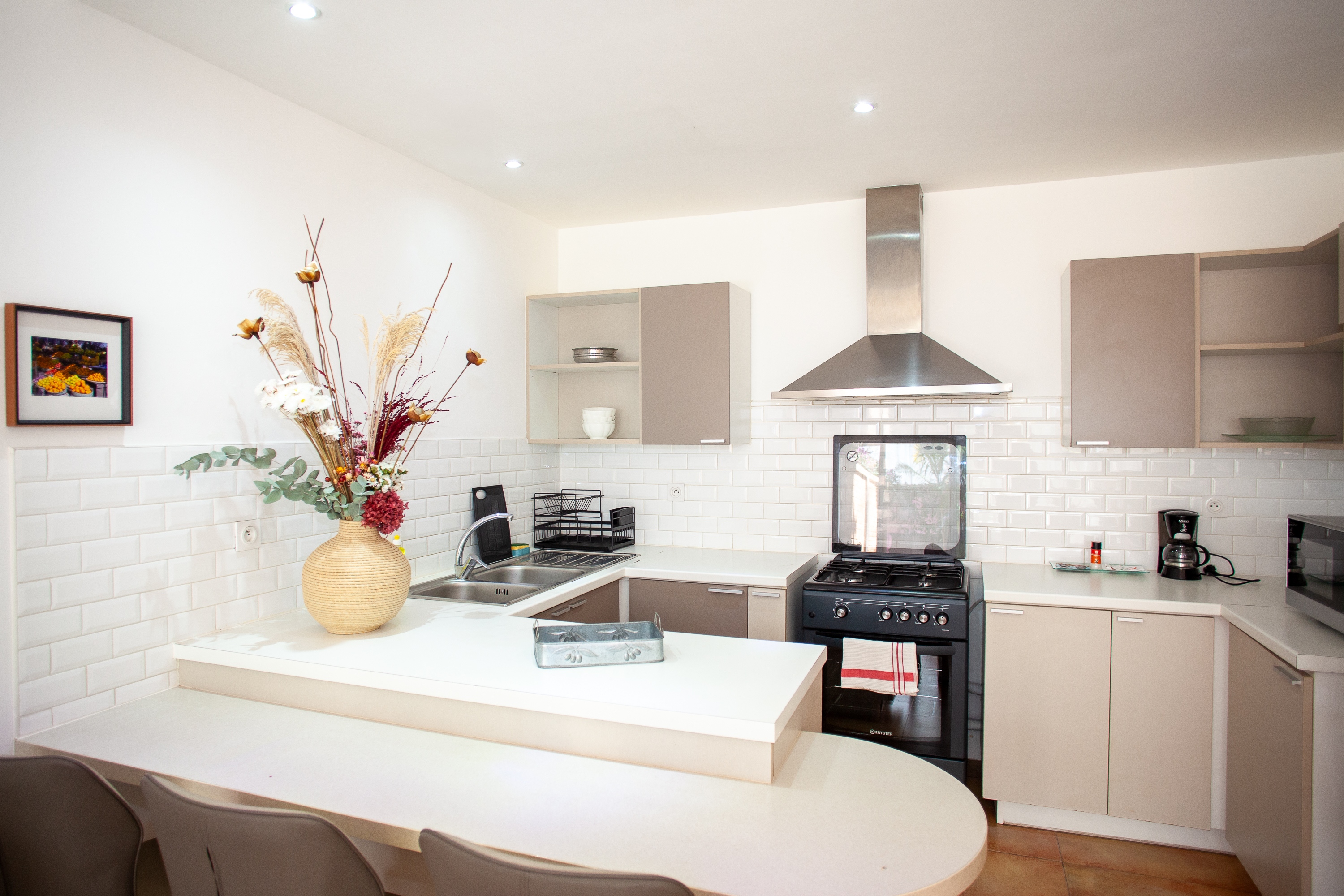 Cuisine ouverte entièrement équipée : réfrigérateur, plaques de cuisson, micro-ondes, vaisselle, ustensiles.